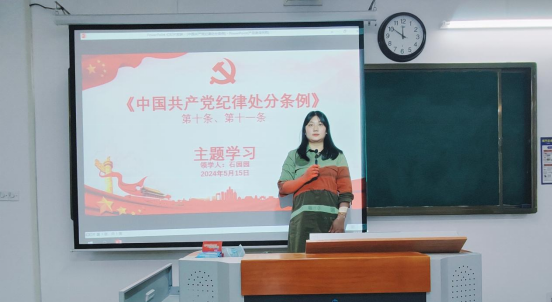为深入学习贯彻习近平总书记关于党纪学习教育的重要讲话指示精神,学习领会新修订的《中国共产党纪律处分条例》和《中国共产党廉洁自律条例》及《中国共产党问责条例》,增强党员的纪律意识,强化正风肃纪。2024年5月15日,best365官方网站经济学管理学学生党支部于一教219进行专题学习。会议由管理学党支部书记石园园领学,经济学、管理学学生党支部正式党员和预备党员以及经济学、管理学外出实习党员线上全员参加。