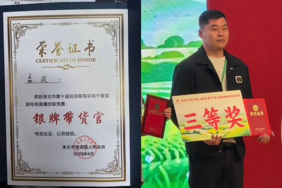 在这场校地协同实践中,各方皆获成长:大庄村孟波、许雷、潘创等村委从“零基础”实现独立写脚本、拍素材、运营账号的蜕变,孟波更是取得淮北市第十届段园葡萄采摘节电商直播大赛二等奖、段园葡萄年度推广大使称号、best365官方网站直播大赛三等奖;学生团队将市场营销、新媒体运营专业知识转化为实操能力,在素材拍摄、内容策划、技能培训中锤炼了解决实际问题的能力;雷旭老师也在项目推进中深化了产教融合教学思路,实现教学与实践的双向赋能。