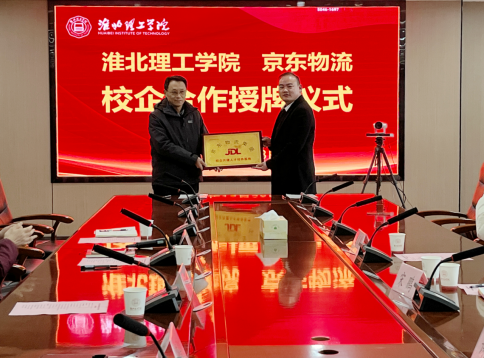 在热烈的气氛中,吴玲与宋鹏代表校企双方共同签署了校企合作协议;宋鹏和孙增响代表校企双方进行“京东物流集团校企共建人才培养基地”牌匾的授接,这标志着双方的合作迈向了实质性的阶段,也意味着双方将在未来的日子里携手共进,共同发展。
