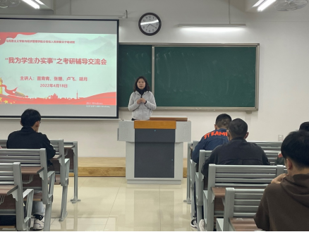 活动开始前,党总支书记吴玲院长向全体参与人员阐明此次考研辅导交流会的起因和重要意义,并点赞选定考研目标的各位同学,同时告诫同学们目标是要通过奋斗和努力才能获得。她还承诺学院将根据同学们的需要开展系列的考研辅导活动,让考研之风助力学院的学风和班风。