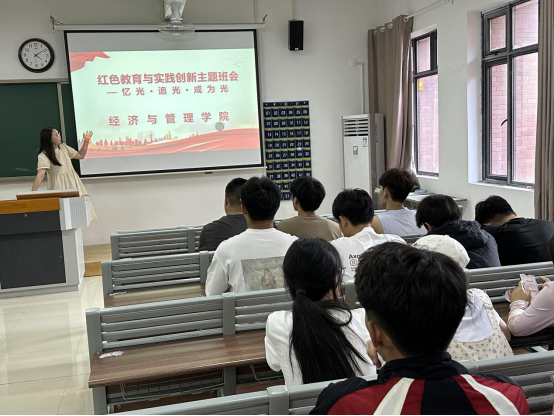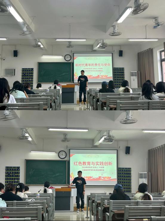 在开展班会过程中,开展了大学生创新创业“青年红色筑梦之旅”的经验分享,2021级经济学专业刘成龙同学作为代表在班会上进行了交流与分享。首先他介绍了大学生创新创业“青年红色筑梦之旅”的背景和意义。他提到,这一活动旨在通过互联网平台,将红色教育资源与青年学生的创新精神相结合,通过线上线下的互动形式,引导青年学生深入了解党的历史,传承红色基因,同时激发他们的创新思维和创业精神。接着,刘成龙详细分享了自己在活动中的经历和感受。他讲述了自己如何通过网络平台学习红色知识,如何与团队成员共同策划、实施项目,以及在这个过程中遇到的挑战和收获。他特别强调了团队合作的重要性,表示只有团队成员之间紧密合作、相互支持,才能克服各种困难,取得最终的成功。