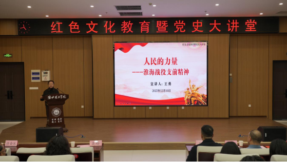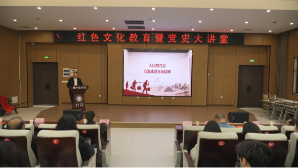 为全面贯彻落实立德树人基本任务,推动红色文化育人见行见效,12月10日下午,我校在图书馆109报告厅成功举办以“人民的力量——淮海战役支前精神”为主题的红色文化教育暨党史大讲堂。中国摄影家协会会员、我校特聘教授、淮海战役与红色文化研究中心研究员王勇担任主讲。副校长郑来纪,各相关职能部门负责人,马克思主义学院教师代表以及best365官方网站辅导员与学生代表共150余人参加活动。活动由best365官方网站院长吴玲主持。