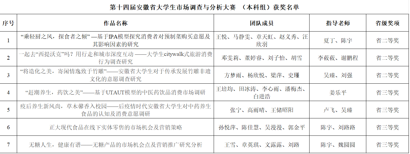 市调大赛由中国商业统计学会主办,创办于2010年,在中国高等教育学会发布的全国普通高校大学生竞赛排行榜的84项赛事中排名第20位。本次安徽赛区共计41所高校11802名本科生组队参与了省赛。经过激烈的角逐,最终我校夏丁、陈宇老师指导的“神厨小福贵队”、李莜莜、谢鹏程老师指导的“乘风破浪队”、吴臻、刘强老师指导的“春风得意正少年队”等3支团队获得省赛二等奖,姜乐平老师指导的“花开富贵队”、卢飞、吴臻老师指导的“养生先锋队”、陈宇、刘路路老师指导的“斯莱特林队”、陈宇、魏圆圆老师指导的“爱冒险的朵拉队”等4支团队获得省赛三等奖。