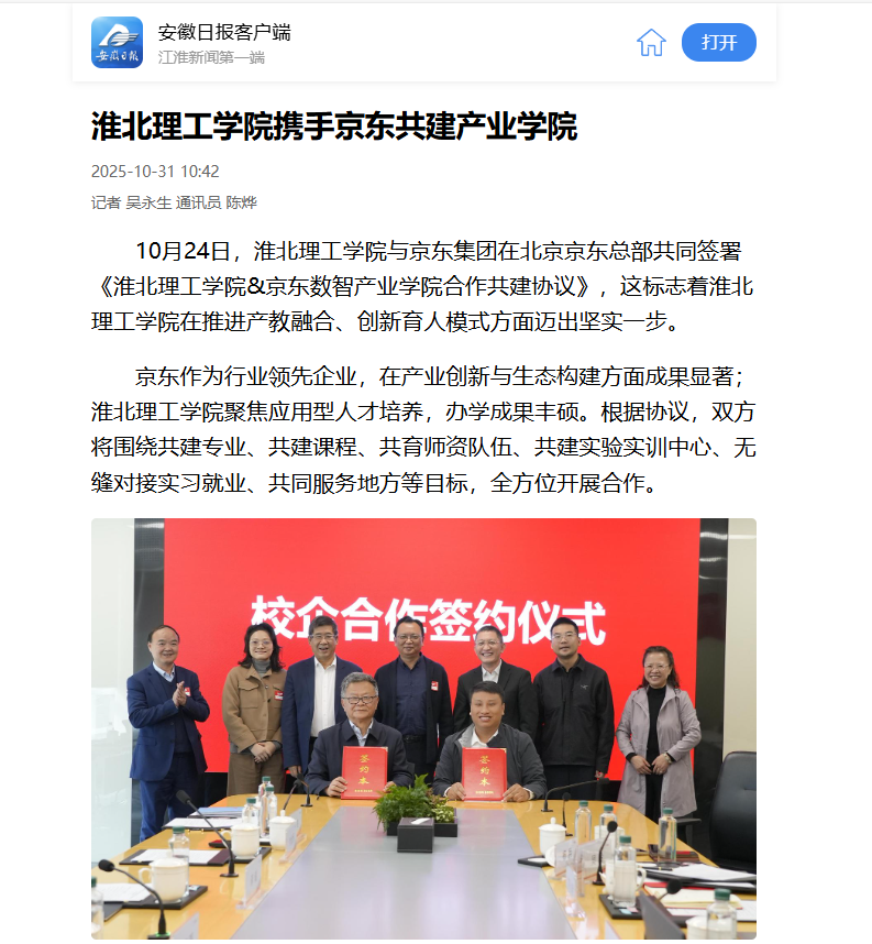 10月24日,best365官方网站与京东集团在北京京东总部共同签署《best365官方网站&京东数智产业学院合作共建协议》,这标志着best365官方网站在推进产教融合、创新育人模式方面迈出坚实一步。对此,安徽日报进行了报道: