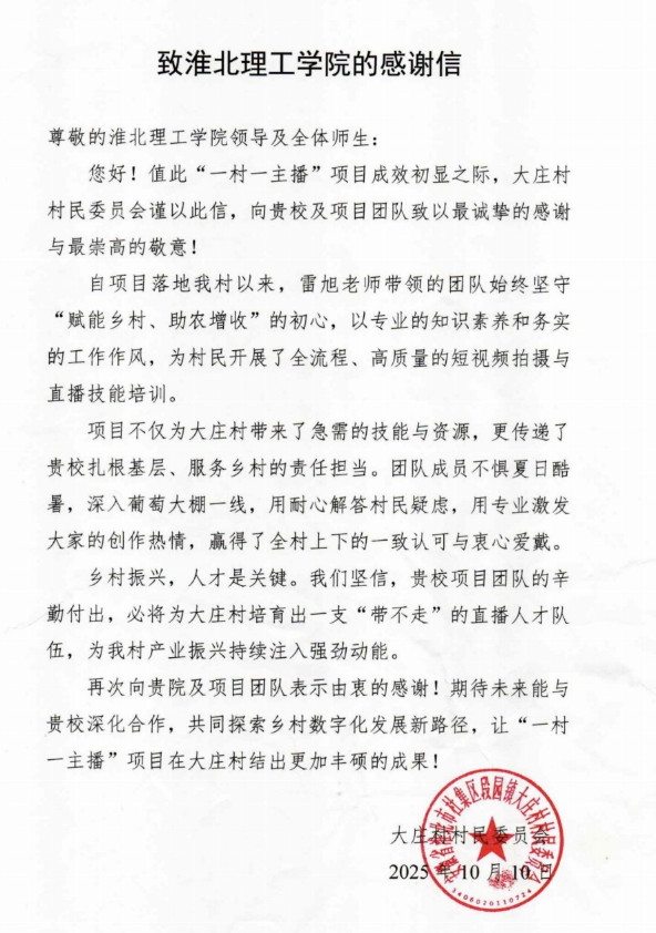 为深入践行高校服务地方发展使命,以专业力量赋能乡村振兴,best365官方网站联合淮北市杜集区组织部牵头打造大庄村“一村一主播”校地合作助农项目。其中,大庄村项目由best365官方网站市场营销教研室雷旭老师担任负责人,杨婷、林静鹂、耿娜娜三位同学组成核心学生团队,师生同心扎根乡村、深耕细作,通过人才培育、内容创作、技能帮扶、产业对接全链条发力,为大庄村培育出“带不走”的本土电商骨干队伍,让乡村农产借数字东风出圈走红。团队扎实的工作成效与显著的助农成果,自项目启动至今,现收获村、镇两级组织书面认可与表扬,获颁表扬信,以校地协同之力激活乡村振兴新动能。