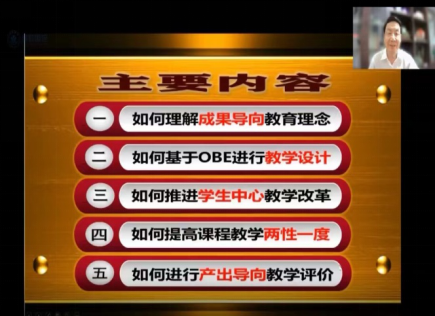 “一流专业建设核心理念解析与教学改革”专题的主讲人是国家督学工程教育专业认证和教育教学评估专家李志义教授。李志义教授分别以如何理解成果导向教育理念、如何基于OBE进行教学设计、如何推进学生中心教学改革、如何提高课程教学两性一度,如何进行产出导向教学评价等五个维度作了详细的讲解。本次课程围绕OBE理念,聚焦一流人才培养,建设一流专业,打造一流课程。探讨OBE工程教育模式下课程教学设计,树立专业认证新理念,掌握专业认证新标准,把OBE教学理念落实到人才培养的各个环节,以此推动一流专业和一流课程建设,从专业、课程和课堂教学三个层面上真正理解如何在教与学过程中实施OBE理念,切实提高本科教学水平和人才培养质量。