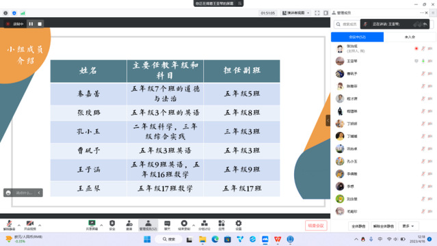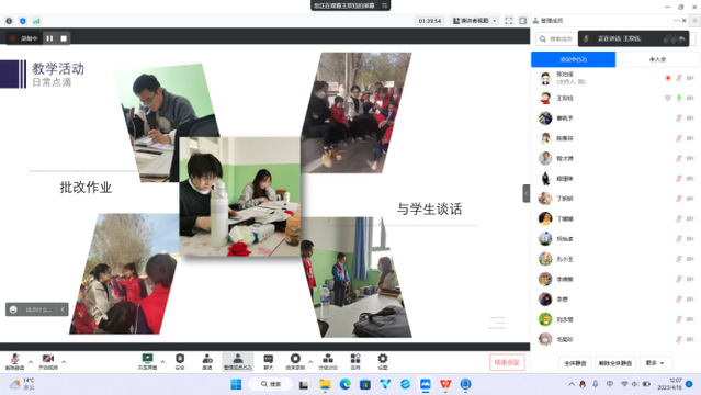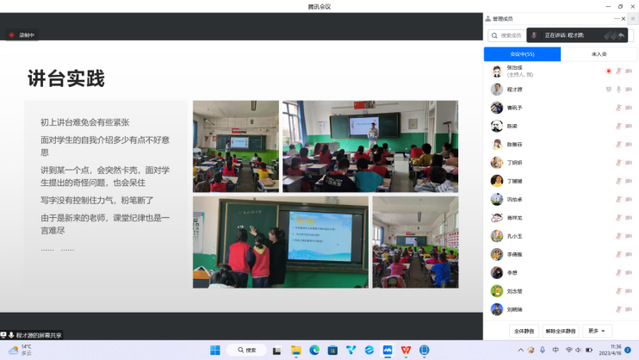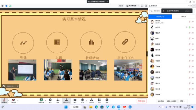 汇报由带队教师张治成老师主持,分为11个小组,各小组通过PPT展示进行详细汇报。实习支教学生就一个多月以来的备课讲课、听课、作业批改、教学反思、公开课、班主任工作等方面进行了分享汇报。