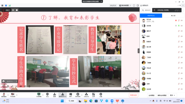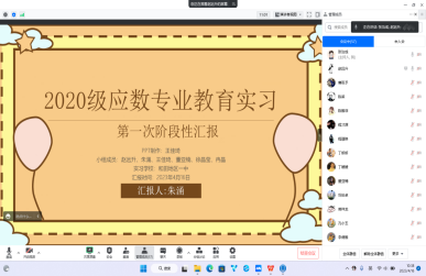 本次实习第一次阶段性汇报大会已逐渐进入尾声,实习带队教师张治成老师通过责任、情怀、幸福三方面对本次线上汇报会进行回顾和总结。他表示,实习支教工作是师范生的一项重要的学习任务,也是一次难得的挑战,鼓励实习教师要踏踏实实做好每一份教学工作,去感受做一名教师的幸福感。并从如何跟随指导教师学习、实习生的每日听课、实习生公开课、线上常规课等方面提出了具体要求,取长补短确保实习工作落到实处。他希望同学们能够继续保持钻研教学的热情,突破难点的勇气以及持之以恒的态度,在今后的学习实践中不断成长。